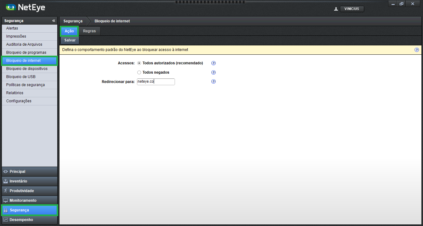 A aba “Ação” será aberta, e lhe permitirá selecionar entre duas opções. A opção “Todos autorizados”, irá liberar acesso a todos os sites, sem exceção, bloqueando somente aqueles para os quais houverem regras criadas (aprenderemos a criar regras a seguir). A opção “Todos negados” irá bloquear o acesso a qualquer site, liberando acesso apenas àqueles que possuírem regras criadas. Além das opções de acesso, temos ainda o campo que define para qual endereço os sites bloqueados serão redirecionados (é possível configurar apenas domínios. Ex: google.com, facebook.com, neteye.co).